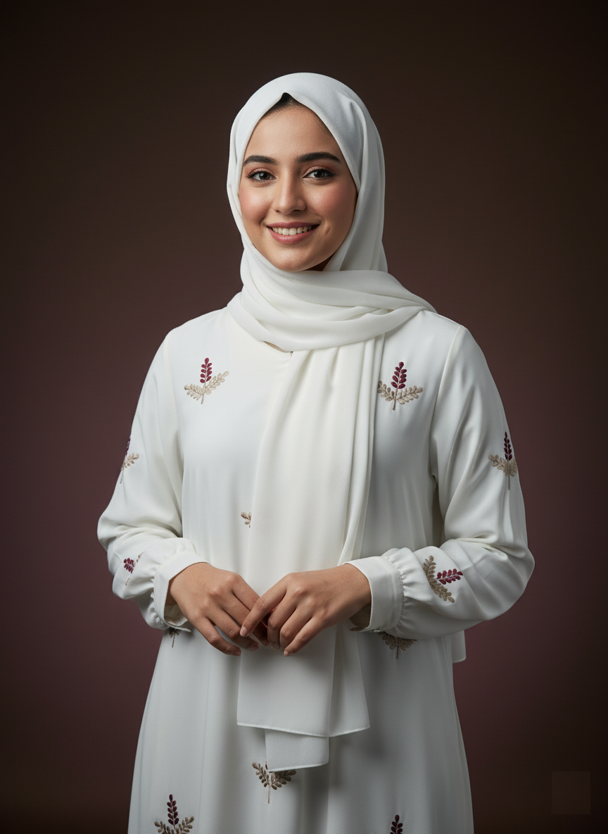 Crafted from premium Nidah fabric, this elegant abaya features delicate leaf embroidery on a pristine white canvas. A matching scarf is included, offering a complete and graceful look perfect for any special occasion.