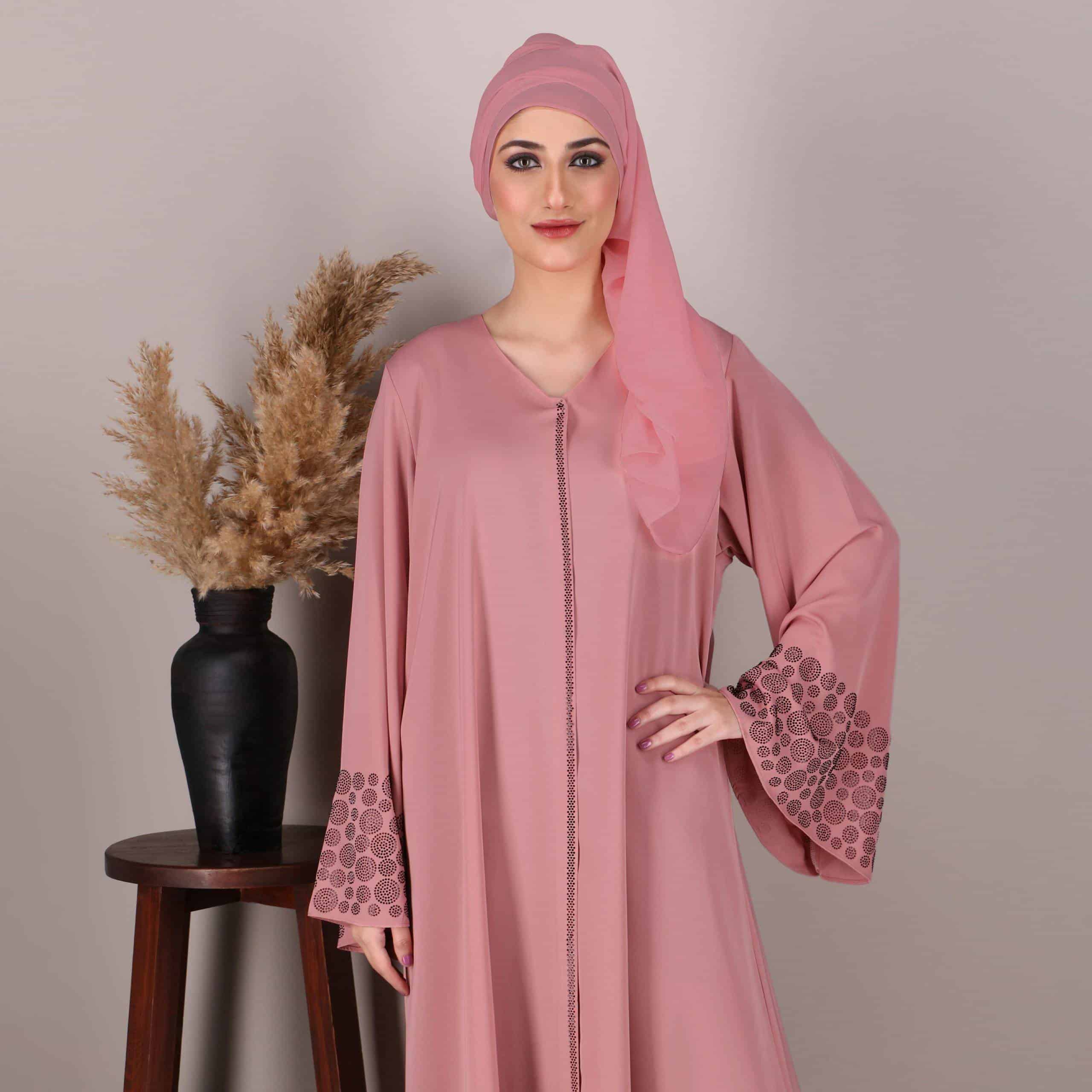 About the product: Coraline–Simple Pink Color Abaya With Embellishment Of Stones, Good for casual use . Matching Hijab Included. Size Recommendation: Model Height 5.5″(wearing Size 54″) Dry Clean only, No Machine Wash. Specifications: