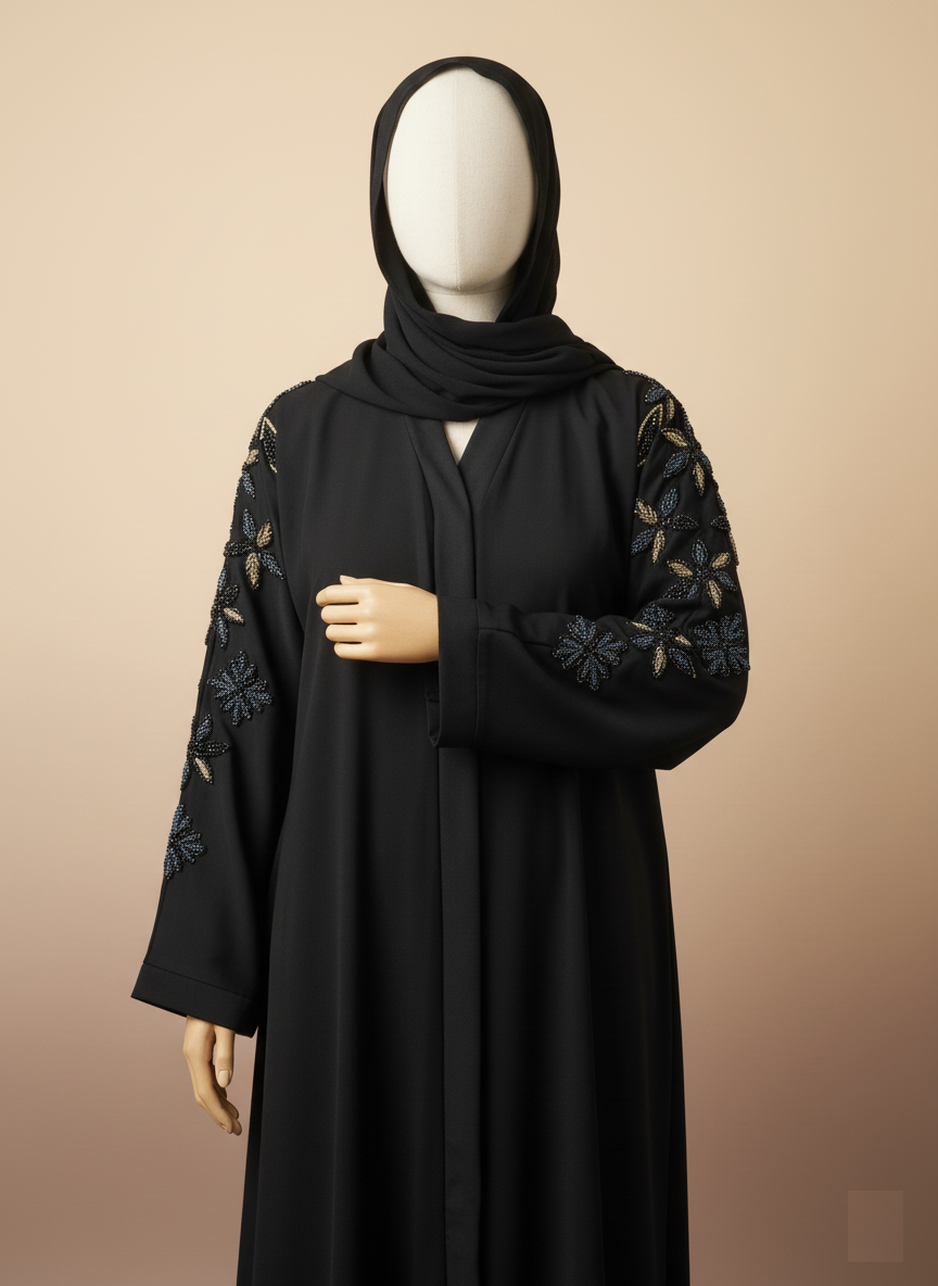 Discover refined beauty. This abaya showcases elegant gold and silver beaded floral patterns on the sleeves, offering a beautiful contrast against the rich black fabric. A statement piece that is both modest and captivating.