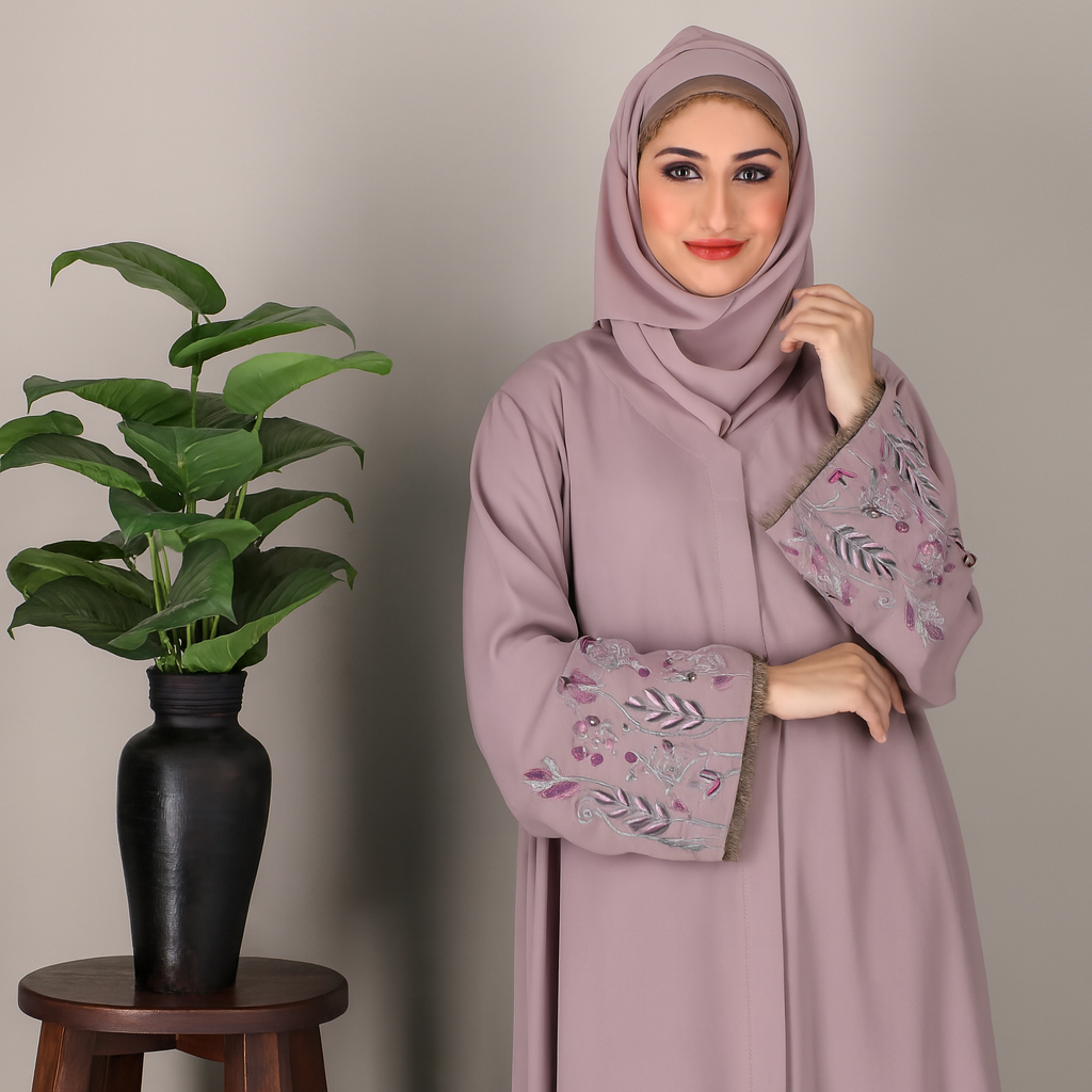 Lilac Aafrozah Abaya–This Abaya of light color looks very elegant & stylish. Delicate embroidery on sleeves make its complete match, thread work on sleeves . Matching Hijab Included.