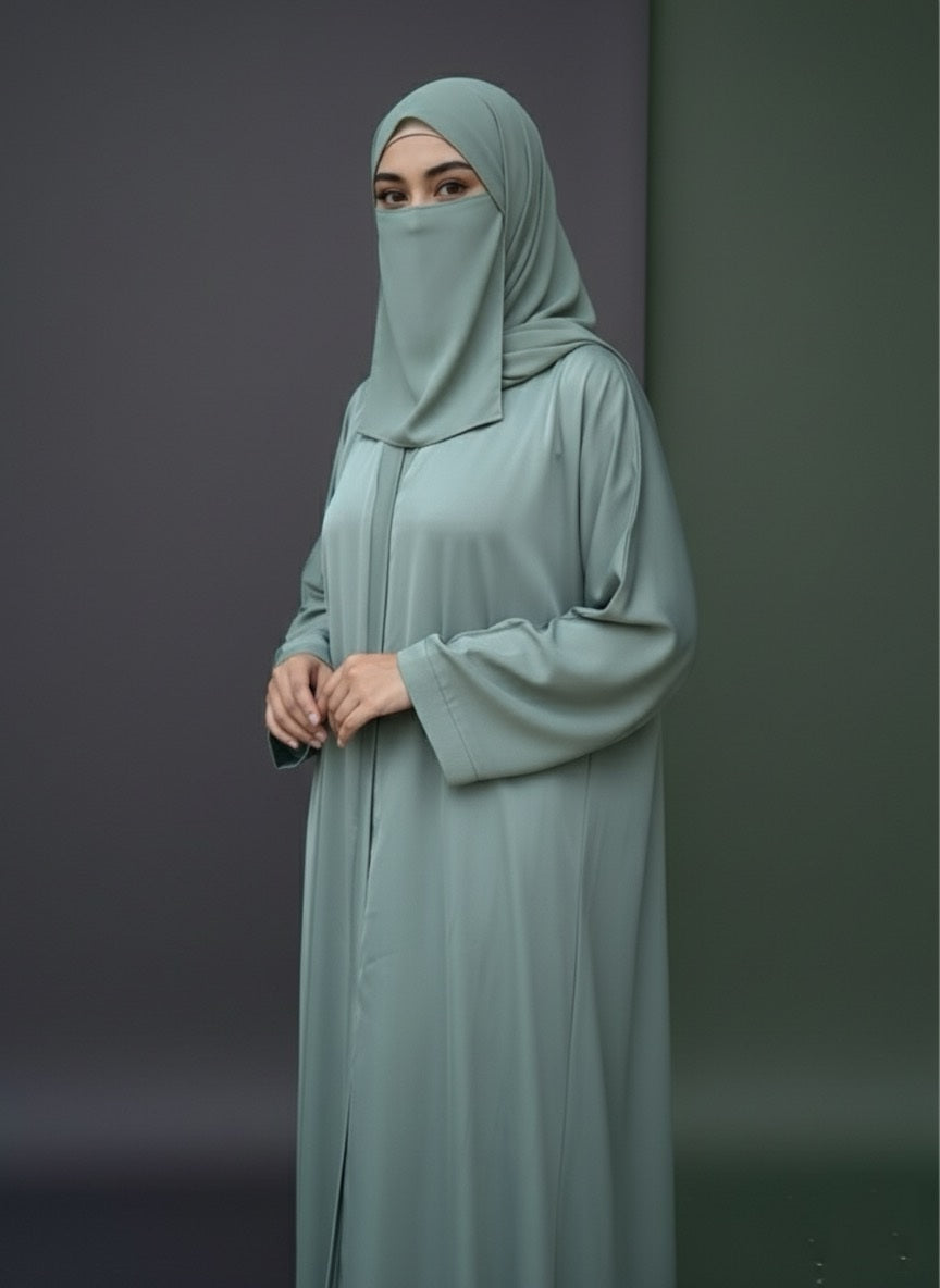 Drape yourself in effortless sophistication with our sage-hued abaya. Made from luxurious TikTok fabric, its lightweight and flowing silhouette is paired with a matching scarf for a complete, graceful look. Perfect for everyday elegance.